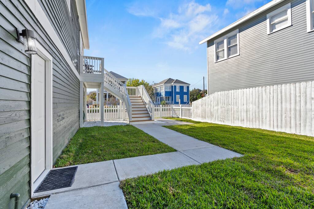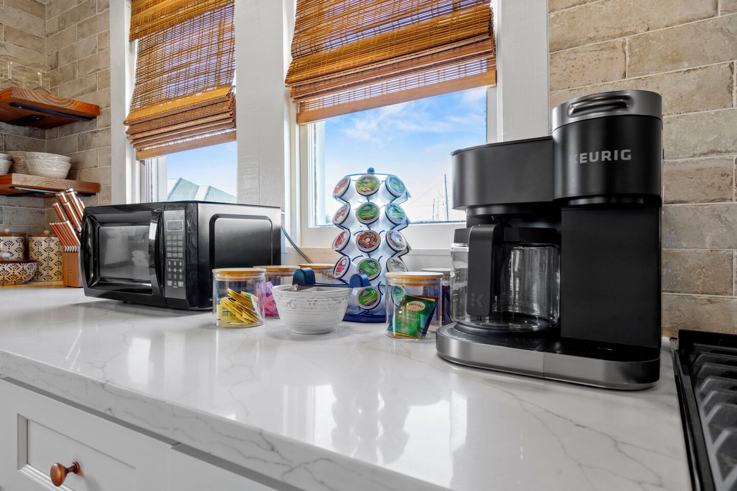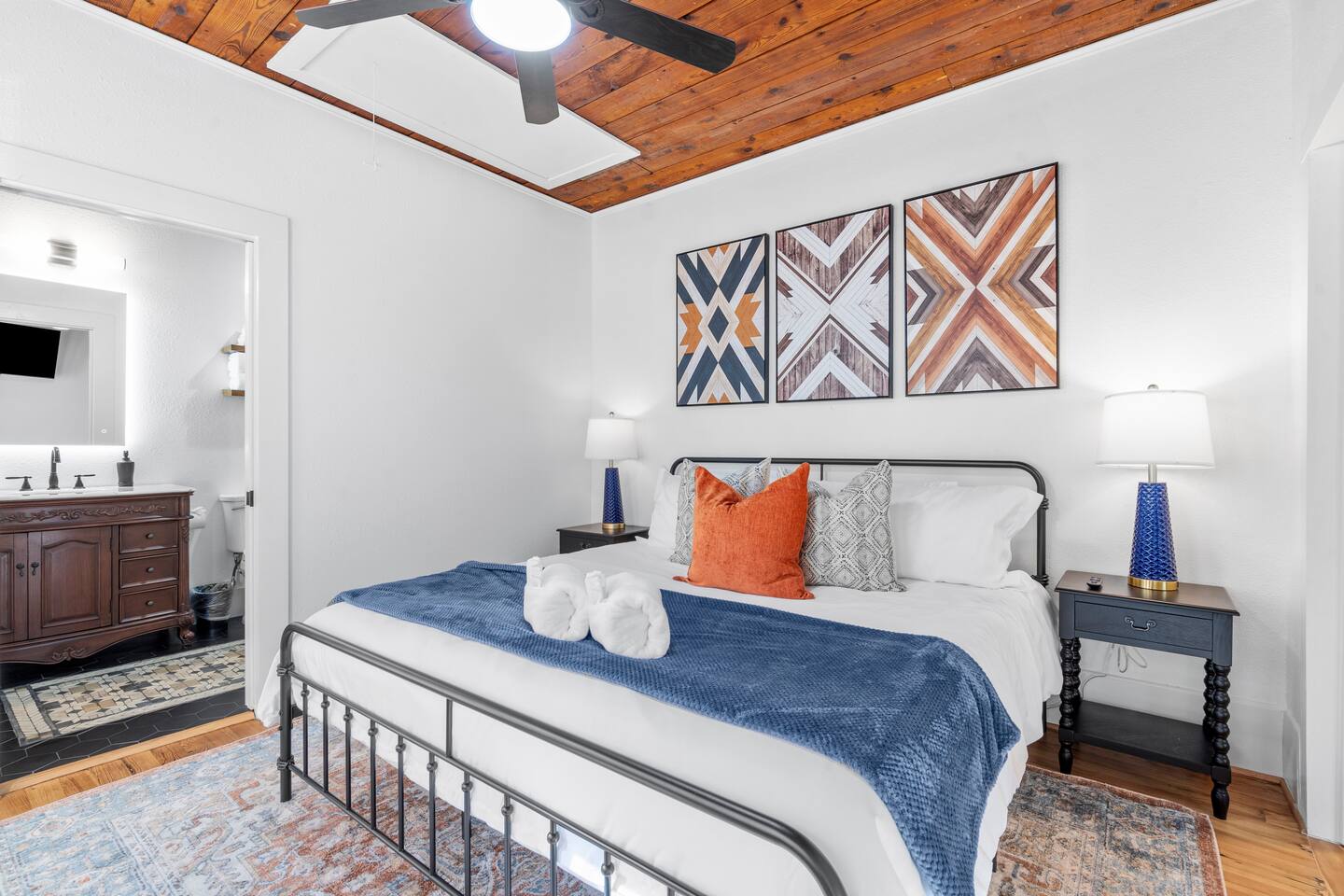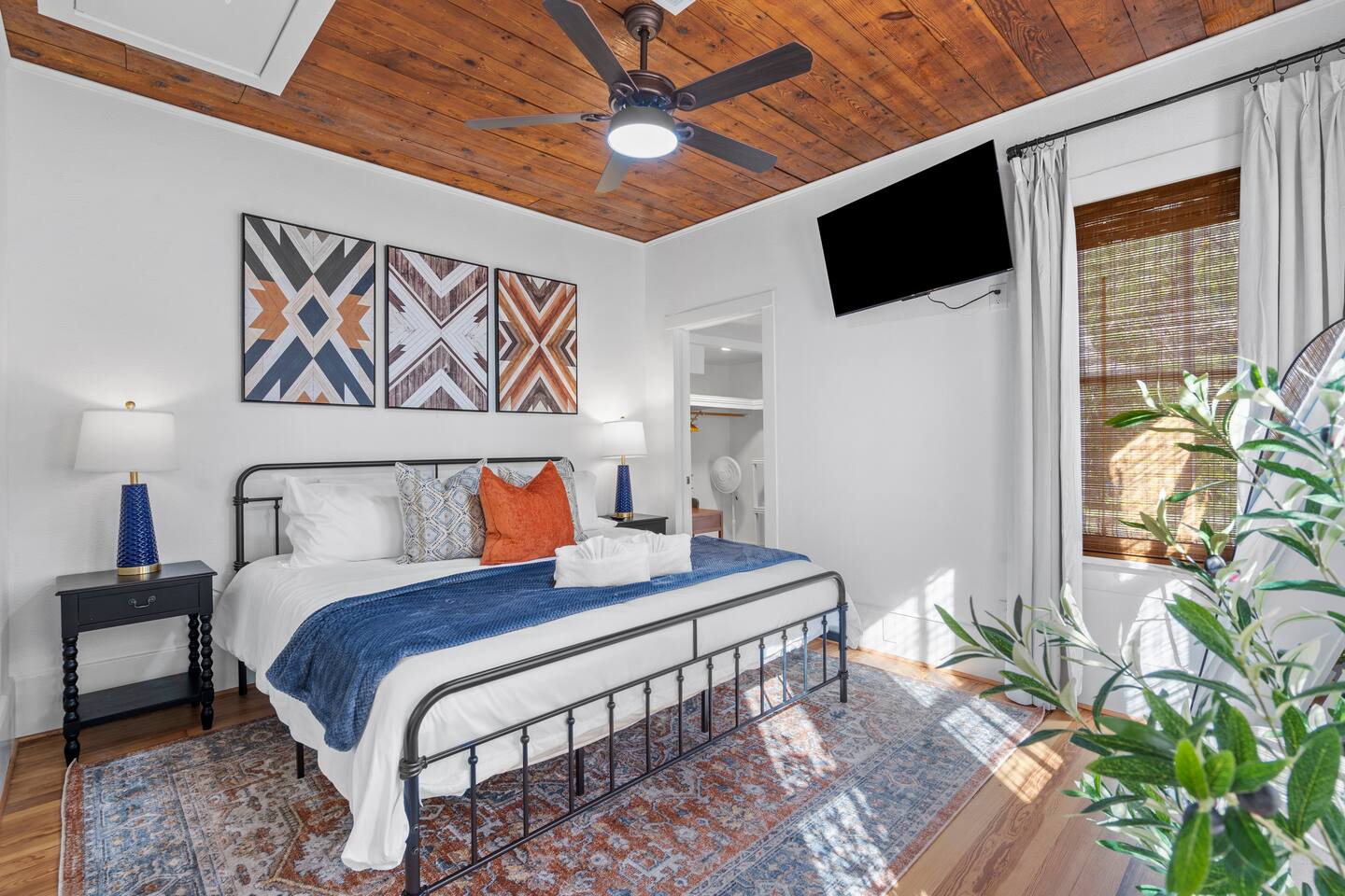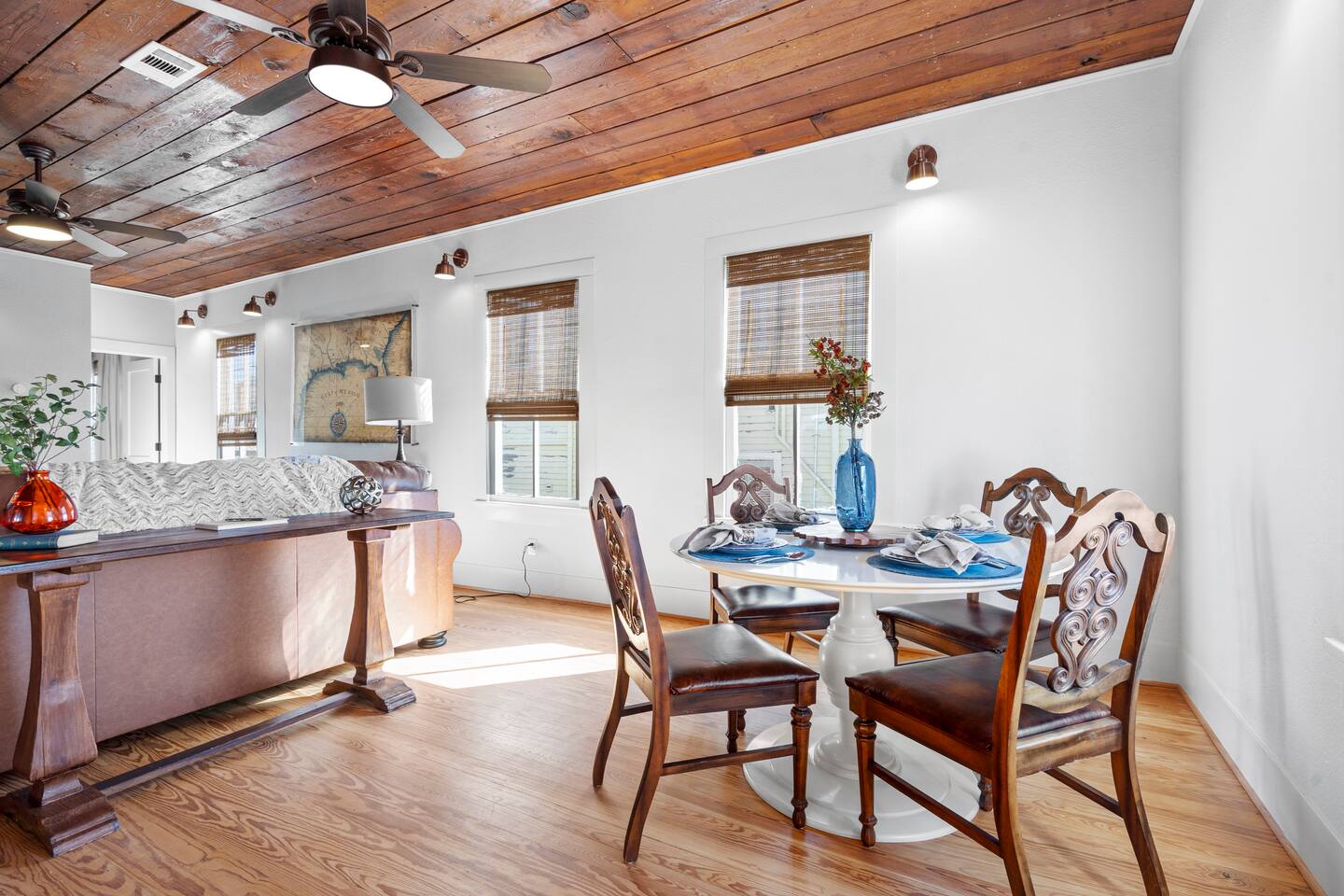 Beautiful retreat in the heart of East End Historic District Completely renovated in 2023, the house is nestled in the desirable East End Historic District. This 2-bedroom, 2-bathroom home is within walking distance to beaches, attractions, restaurants, art, nightlife, and shopping. You'll love the beautiful luxury design of this unique home. Indoor space: • Fast fiber Wi-Fi and office space with desk • Smart TVs with Roku in living room and both bedrooms • Gourmet level - fully equipped kitchen with an island for entertaining • Primary bedroom features a king bed, USB chargers on nightstands, and a private bathroom with large walk-in shower & rain showerhead • Secondary bedroom offers a queen bed, USB chargers on nightstands, and a conveniently adjacent bedroom equipped with bath bombs for a relaxing bath • Queen sofa bed in living room • Washer and dryer • Central heating and AC • Small appliances (microwave, toaster, blender, crockpot, kettle) and lots of extras • Coffee area with Keurig Duo and selection of coffee and sugars • High quality bedding, towels, and bath products • Games and toys • Iron board and iron • Pack and play • Hairdryers Outdoor space: • Fully fenced • Balcony with seating • Covered seating area in courtyard with string lights • Outdoor firepit with seating • Keyless entry Rest assured, your safety and comfort are our top priorities. Our home undergoes thorough professional cleaning and sanitation after each stay. Please note that for added security, we have installed exterior security cameras facing the yard, front porch, and front gate, respecting your privacy with no cameras inside the home. Whether you're planning a short getaway or an extended retreat, our home is perfectly suited to cater to you and your family's needs. Let us know how we can enhance your stay and make your visit truly exceptional. I am a Certified Tourism Ambassador for Galveston and here to assist.