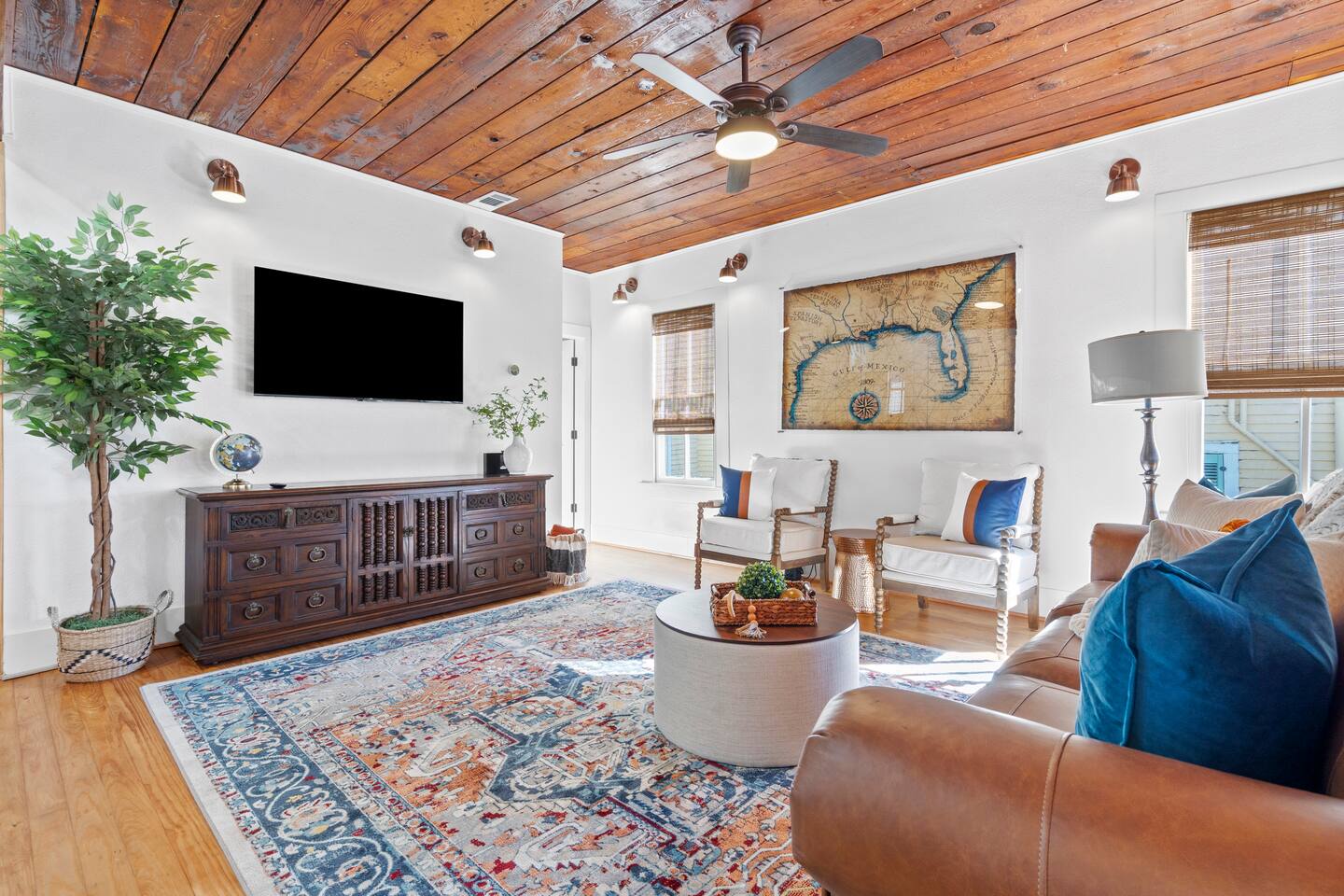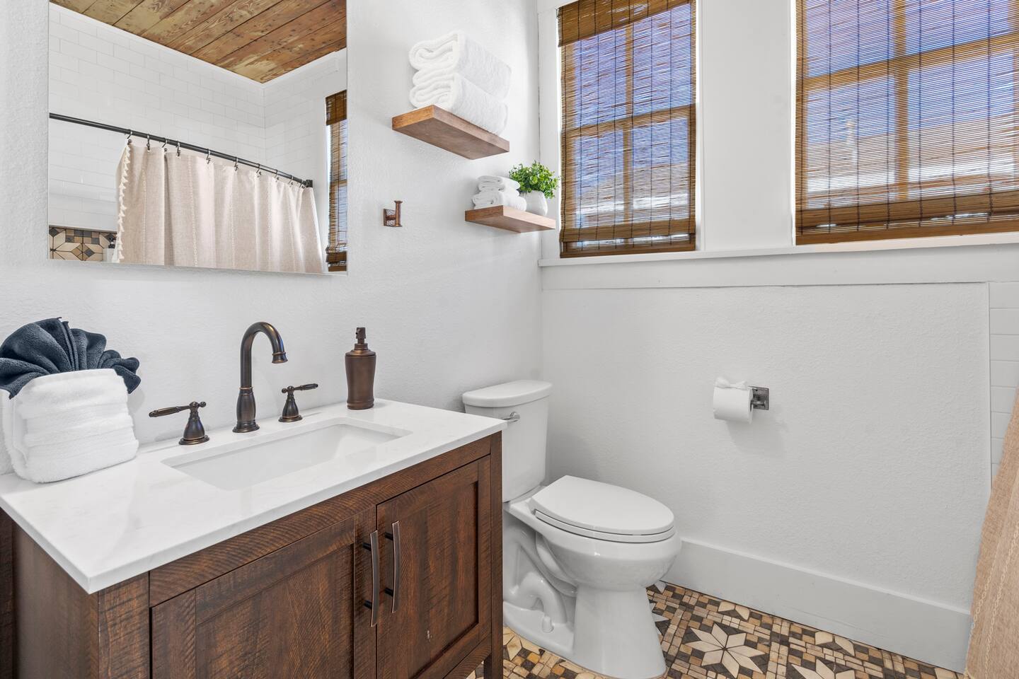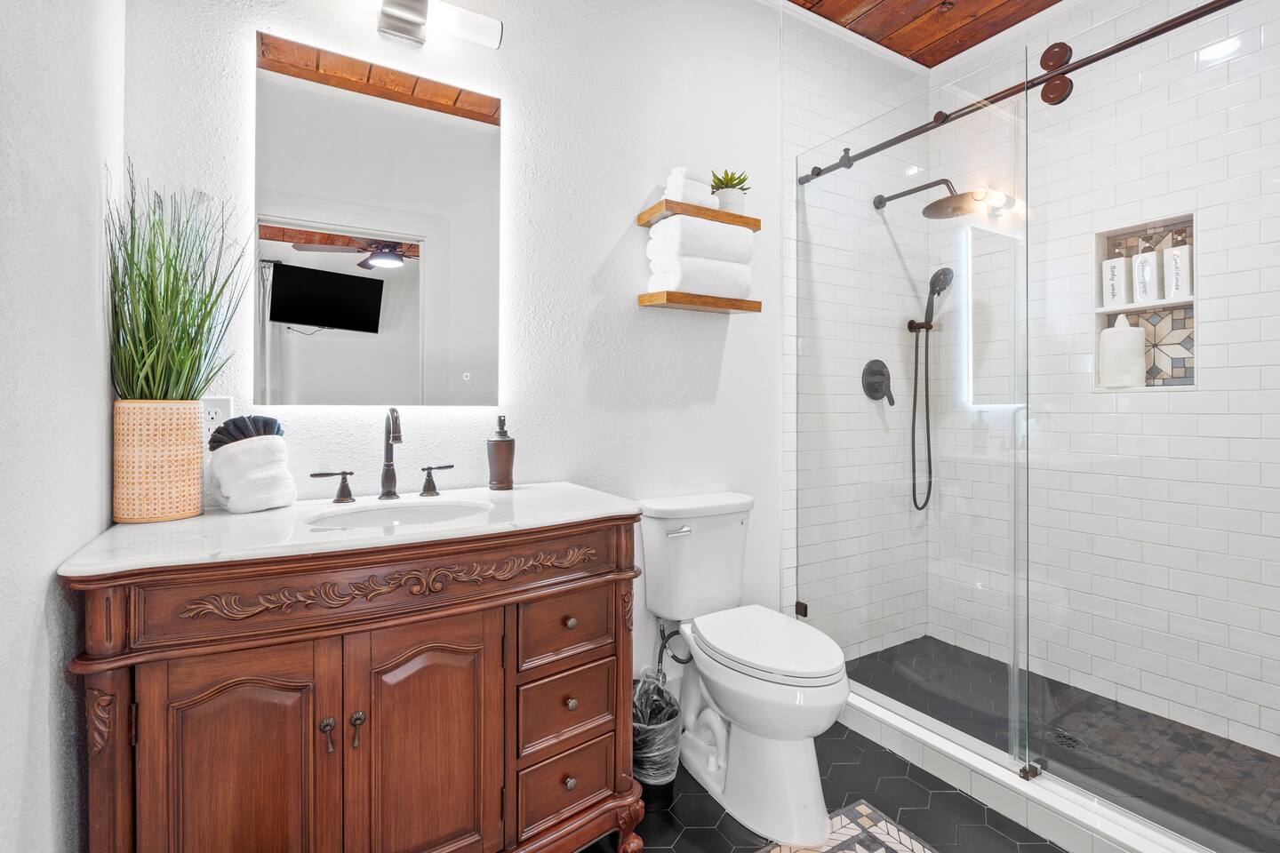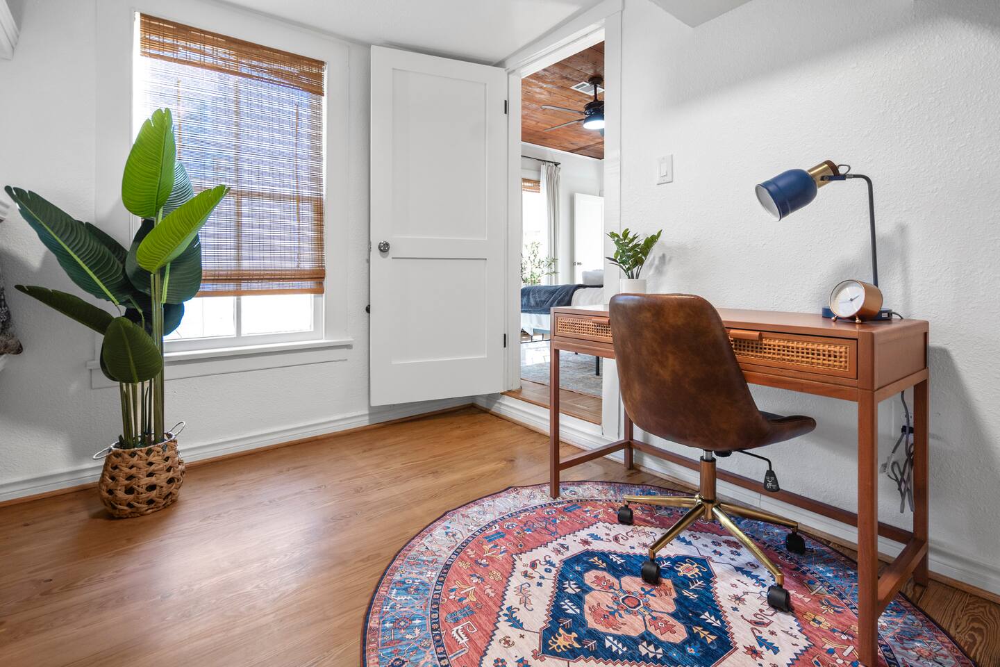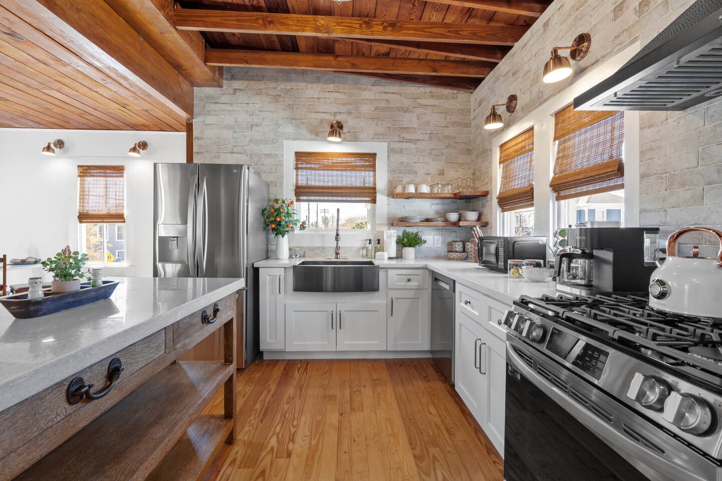 Beautiful retreat in the heart of East End Historic District Completely renovated in 2023, the house is nestled in the desirable East End Historic District. This 2-bedroom, 2-bathroom home is within walking distance to beaches, attractions, restaurants, art, nightlife, and shopping. You'll love the beautiful luxury design of this unique home. Indoor space: • Fast fiber Wi-Fi and office space with desk • Smart TVs with Roku in living room and both bedrooms • Gourmet level - fully equipped kitchen with an island for entertaining • Primary bedroom features a king bed, USB chargers on nightstands, and a private bathroom with large walk-in shower & rain showerhead • Secondary bedroom offers a queen bed, USB chargers on nightstands, and a conveniently adjacent bedroom equipped with bath bombs for a relaxing bath • Queen sofa bed in living room • Washer and dryer • Central heating and AC • Small appliances (microwave, toaster, blender, crockpot, kettle) and lots of extras • Coffee area with Keurig Duo and selection of coffee and sugars • High quality bedding, towels, and bath products • Games and toys • Iron board and iron • Pack and play • Hairdryers Outdoor space: • Fully fenced • Balcony with seating • Covered seating area in courtyard with string lights • Outdoor firepit with seating • Keyless entry Rest assured, your safety and comfort are our top priorities. Our home undergoes thorough professional cleaning and sanitation after each stay. Please note that for added security, we have installed exterior security cameras facing the yard, front porch, and front gate, respecting your privacy with no cameras inside the home. Whether you're planning a short getaway or an extended retreat, our home is perfectly suited to cater to you and your family's needs. Let us know how we can enhance your stay and make your visit truly exceptional. I am a Certified Tourism Ambassador for Galveston and here to assist.